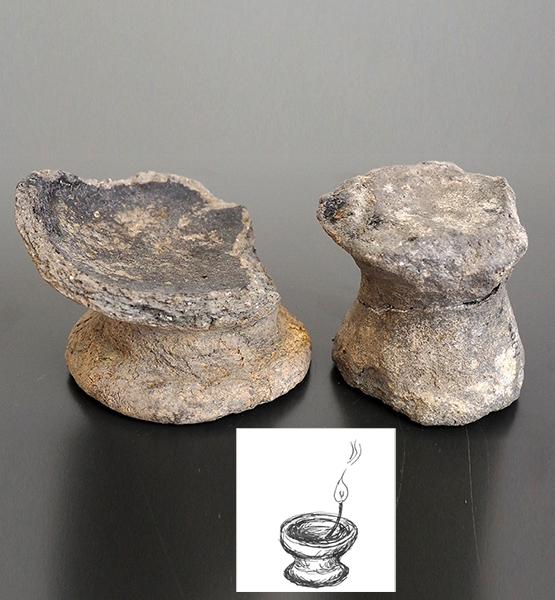 Här är i alla fall ett par oljelampor. Lite trasiga. De är gjorda i grov och enkel svartgodskeramik och har eldats med tran och veke, som på teckningen nedtill.