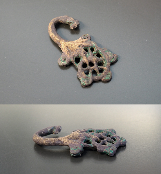 Föremålet är ett 45 millimeter långt beslag med en härva slingor där ett djurhuvud sticker fram och yrvaket säger ”god morgon” till oss. Djurets kropp, slingorna, har fyra nitar i hörnen som berättar att beslaget nitats mot ett föremål. Kanske till änden av ett bälte, i så fall är det en dekorativ hake.