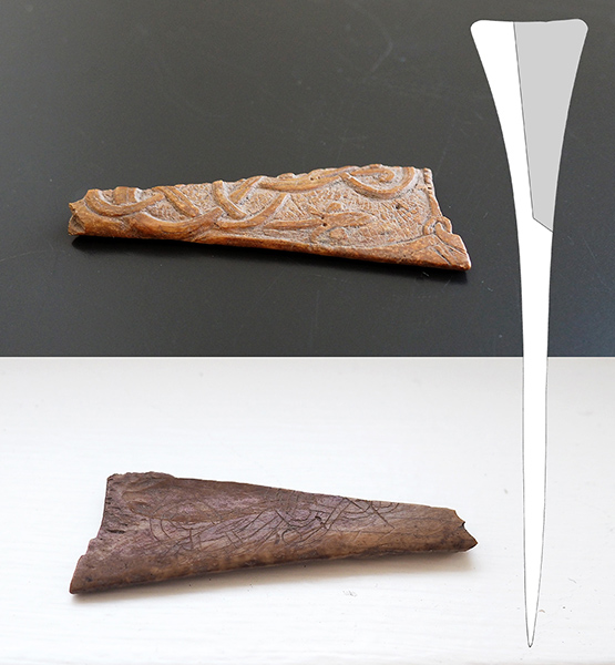 Här är ett fragment av huvudet till en större bennål med triangulärt huvud, men som är sönderbruten både nedtill och längs mitten. Nålen har varit vackert dekorerad med två Urnesdjur som slingrar in sig i varandra, och det skojiga är att det finns en påbörjad skiss till en identisk dekor på baksidan som visar hur den saknade halvan sett ut.