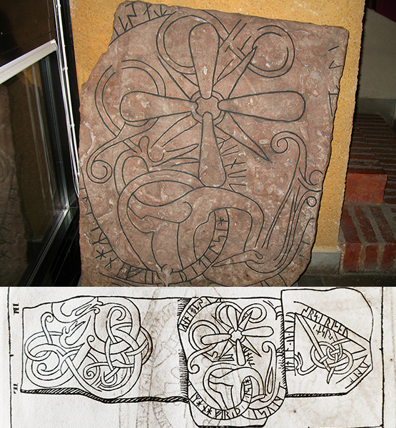 Nedtill ser du en bild av stenen tecknad av akademiritmästare Johan Leitz i slutet av 1600-talet, publicerad i riksantikvarien Johan Hadorphs verk Bautil 1750. Den låg då i Mariakyrkan tillsammans med stenarna U382 och U383. U383 till vänster är ett mästerverk i sen runstensstil – apropå de urnesföremål som vi visat de sista veckorna. Den kan ha tillhört samma gravmonument som U395. Idag finns den stenen hos Historiska museet.