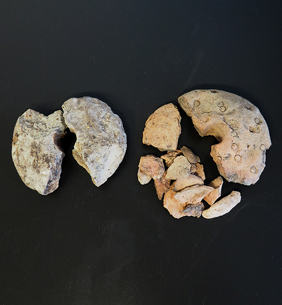 Det du ser överst på bilden är bitar av gjutformar från en verkstad i närheten av Gröna ladan. Gjutformarna kommer från tillverkning av enkolpier, små öppningsbara hängkors med plats för reliker inuti. Du ser på den nedre bilden hur de fungerade – de hade ett gångjärn upptill så att de gick att öppna och stänga.