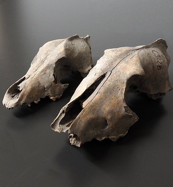 Båda de här kranierna är funna vid utgrävningar i kvarteret Trädgårdsmästaren i Sigtuna. Räven har vi ingen datering på, men vargkraniet kommer från lager daterade 1175–1200. Det är inte alltför vanligt att finna arkeologiska lämningar av varg i medeltida stadslager.