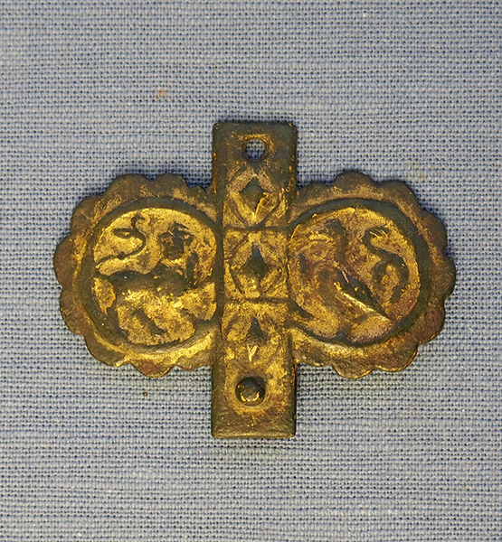 Här är ett av våra väsk- eller bältesbeslag av brons, ungefär 20 millimeter brett. De här beslagen brukar beskrivas som ”östliga” eller ”orientaliska” och de har också sitt ursprung vid Svarta havet bland stäppens nomadfolk; magyarer, volgabulgarer och khazarer. Det är dock möjligt att de även kopierats lokalt av skandinaviska hantverkare.