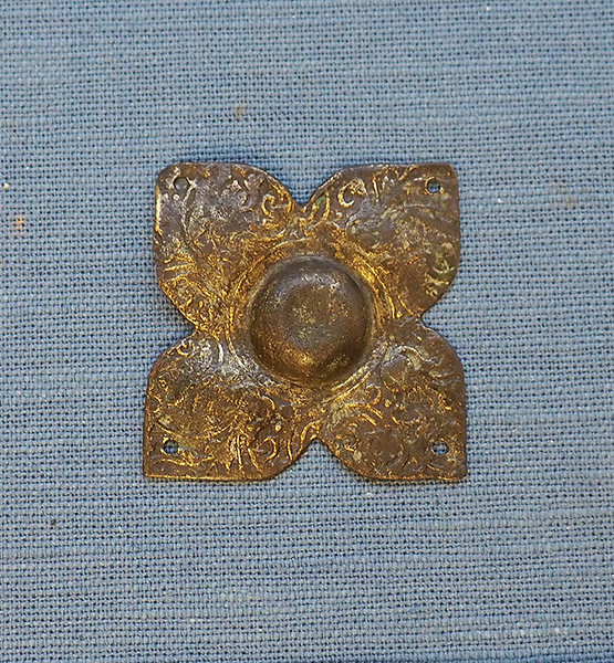 Här är en liten knapp av brons som kan ha suttit som beslag på ett bälte eller en väska. Det är ungefär 14 millimeter i diameter och har en svart avlagring på baksidan som kan vara gammalt läder. Den är hittad i kvarteret Professorn vid Gröna Ladan i Sigtuna, i lager som förmodligen är från 1100-talet.
